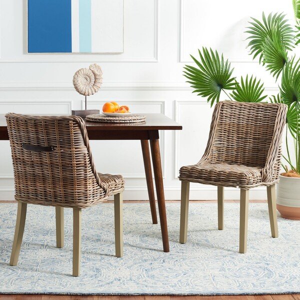 Designed for comfort and casual good looks, this set of two sloping arm dining chairs brings fashion flair to transitional kitchens and dining rooms. Crafted of woven kubu rattan and mahogany in a grey finish, these chic chairs fit beautifully under almost any table.