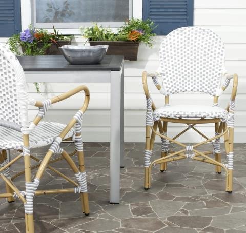 The beloved European bistro chair assumes a coastal cottage vibe in the grey and white Hooper indoor outdoor stacking armchair by Safavieh. The cheerful woven PE wicker seat and back extends to pretty wrap detailing on the faux bamboo frame of this classically styled chair.